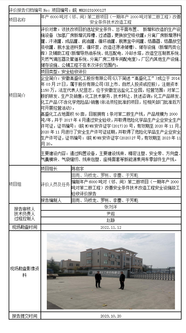 安徽高盛化工股份有限公司 年產6000噸對(鄰、間)苯二胺項目 (一期年產2000噸對苯二胺工程) 改善安全條件技術改造工程 安全設施竣工驗收評價