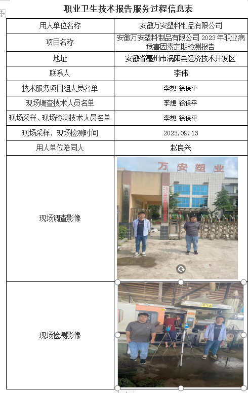 安徽萬安塑料制品有限公司2023年職業病危害因素定期檢測報告