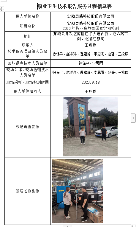 安徽靈感科技股份有限公司 2023年職業病危害因素定期檢測