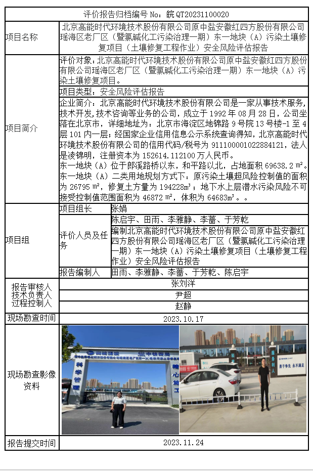 北京高能時代環(huán)境技術股份有限公司原中鹽安徽紅四方股份有限公司瑤海區(qū)老廠區(qū)(暨氯堿化工污染治理一期)東一地塊(A)污染土壤修復項目(土壤修復工程作業(yè))安全風險評估報告
