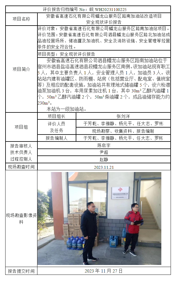 安徽省高速石化有限公司蟠龍山服務區(qū)路南加油站改造項目 安全現(xiàn)狀評價報告