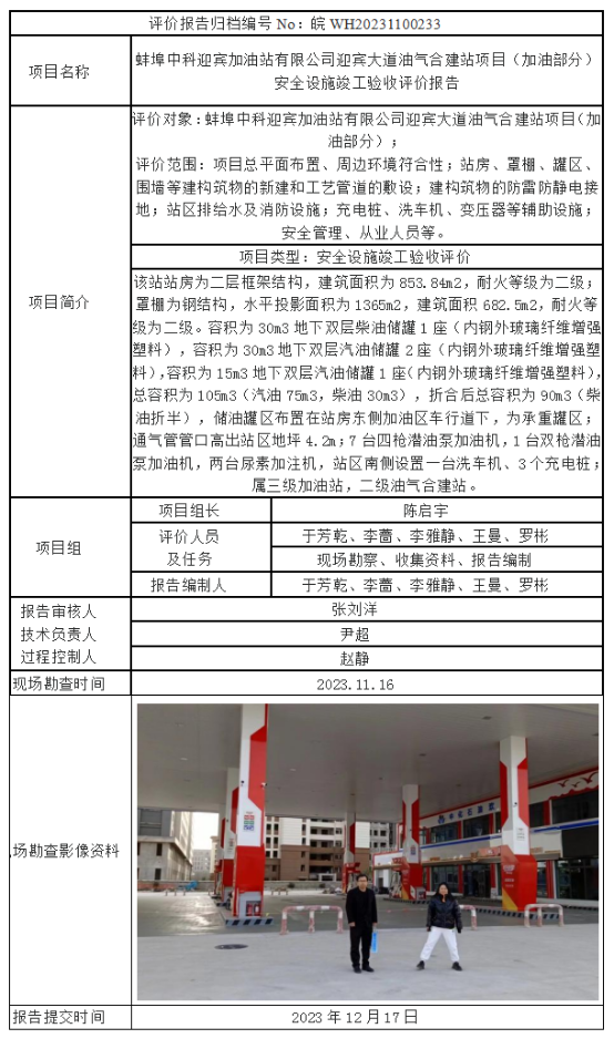 蚌埠中科迎賓加油站有限公司迎賓大道油氣合建站項(xiàng)目(加油部分)安全設(shè)施竣工驗(yàn)收評(píng)價(jià)報(bào)告