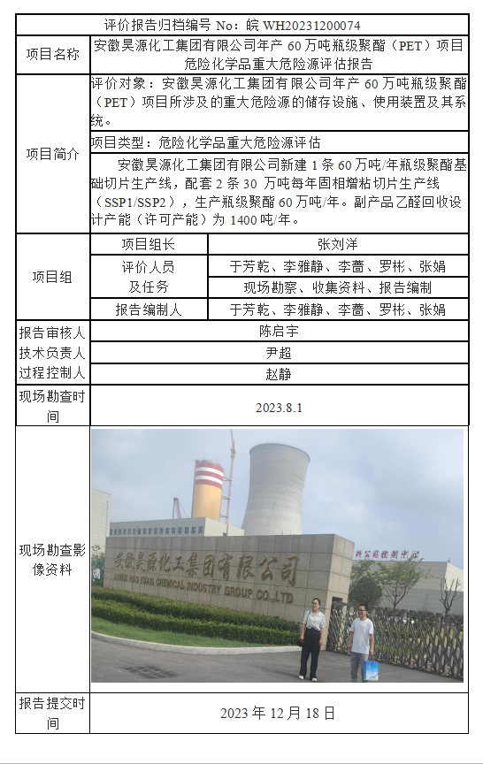 安徽昊源化工集團有限公司年產60萬噸瓶級聚酯(PET)項目危險化學品重大危險源評估報告