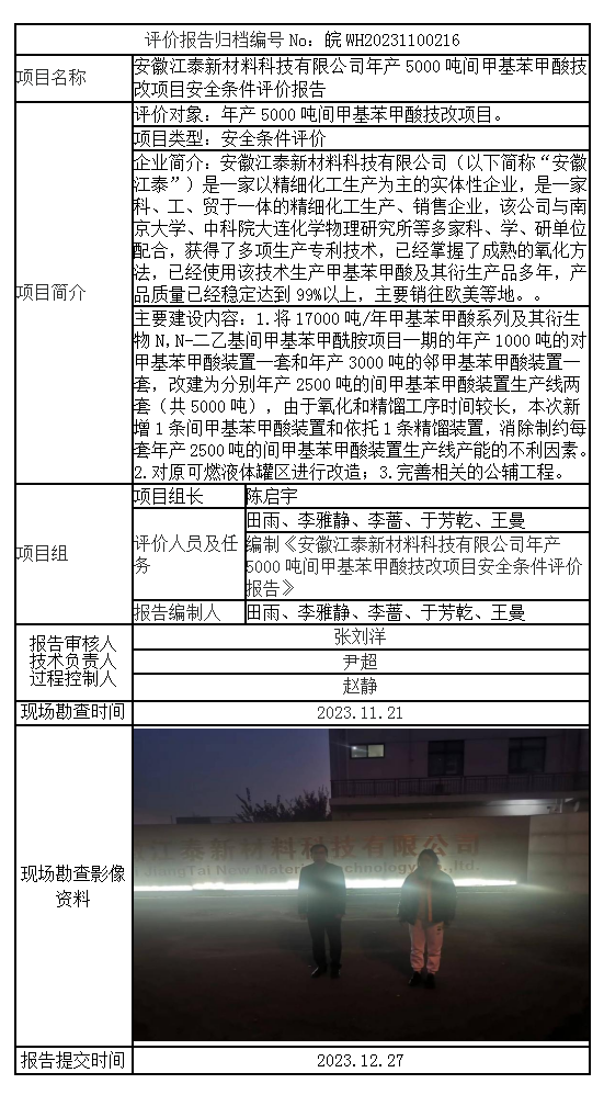 安徽江泰新材料科技有限公司年產5000噸間甲基苯甲酸技改項目安全條件評價報告