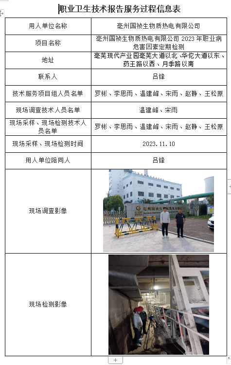 亳州國禎生物質熱電有限公司2023年職業病危害因素定期檢測