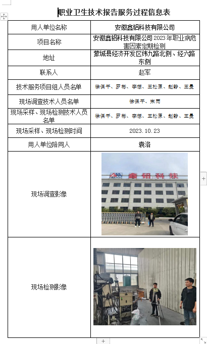 安徽鑫鋁科技有限公司2023年職業病危害因素定期檢測
