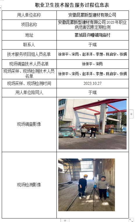 安徽昆蒙新型建材有限公司2023年職業病危害因素定期檢測