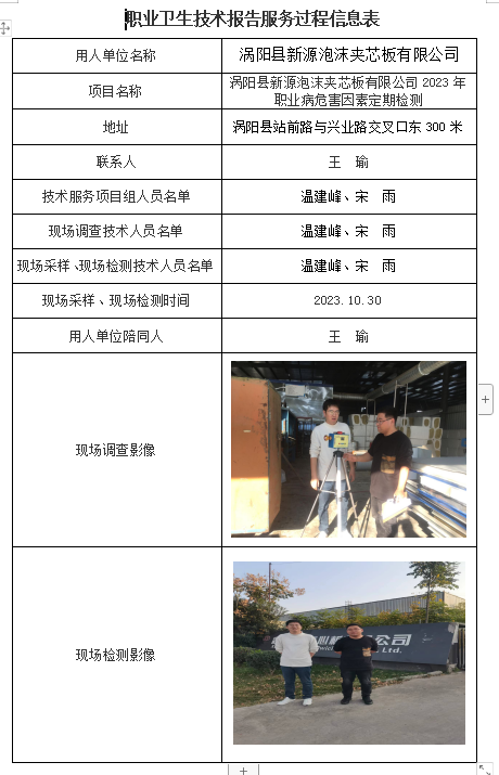 渦陽縣新源泡沫夾芯板有限公司2023年職業病危害因素定期檢測