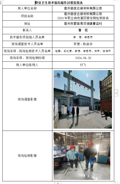 亳州佰世達新材料有限公司2024年職業病危害因素定期檢測報告