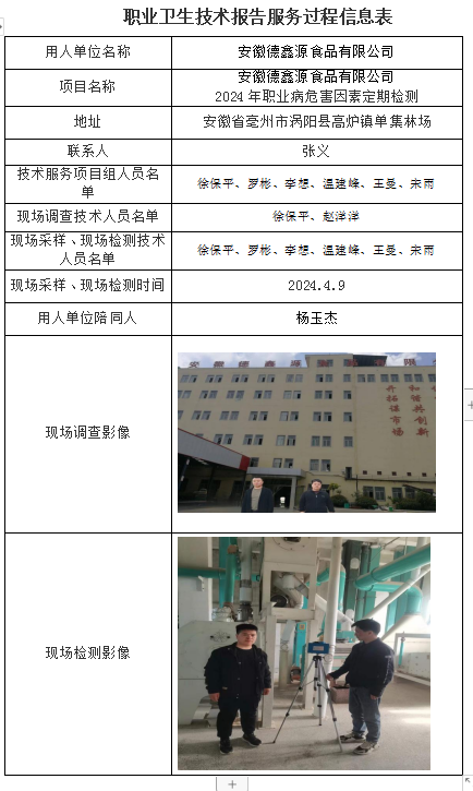 安徽德鑫源食品有限公司2024年職業病危害因素定期檢測