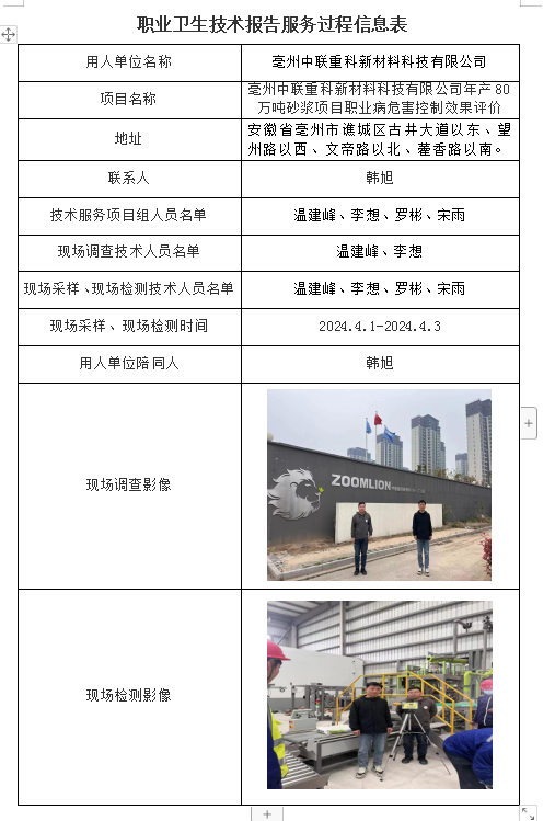 亳州中聯重科新材料科技有限公司年產80萬噸砂漿項目職業病危害控制效果評價