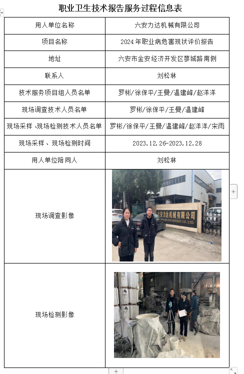 六安力達機械有限公司2024年職業病危害現狀評價報告