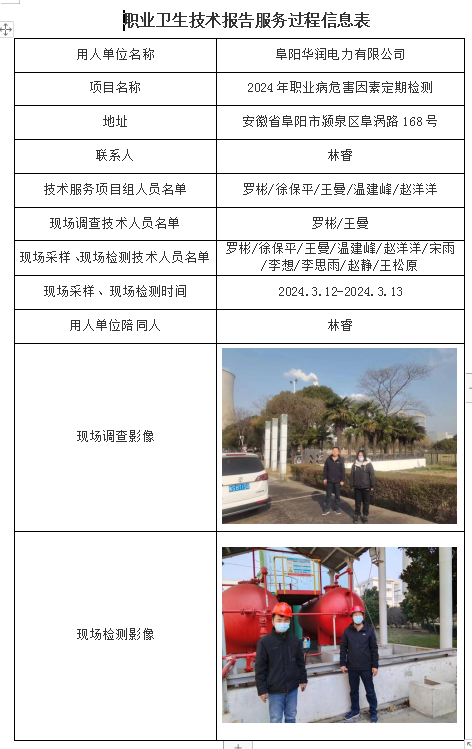 阜陽華潤(rùn)電力有限公司2024年職業(yè)病危害因素定期檢測(cè)