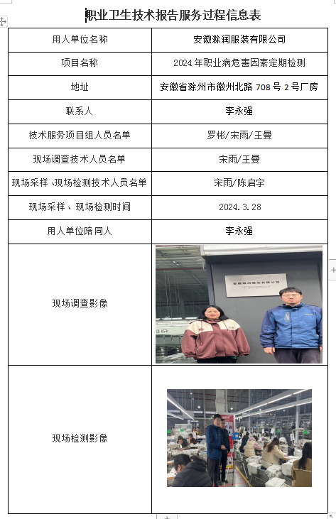 安徽滁潤服裝有限公司2024年職業病危害因素定期檢測
