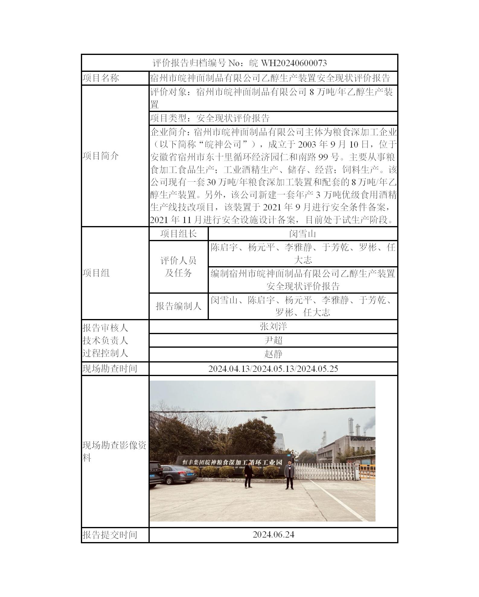 宿州市皖神面制品有限公司乙醇生產裝置安全現狀評價報告