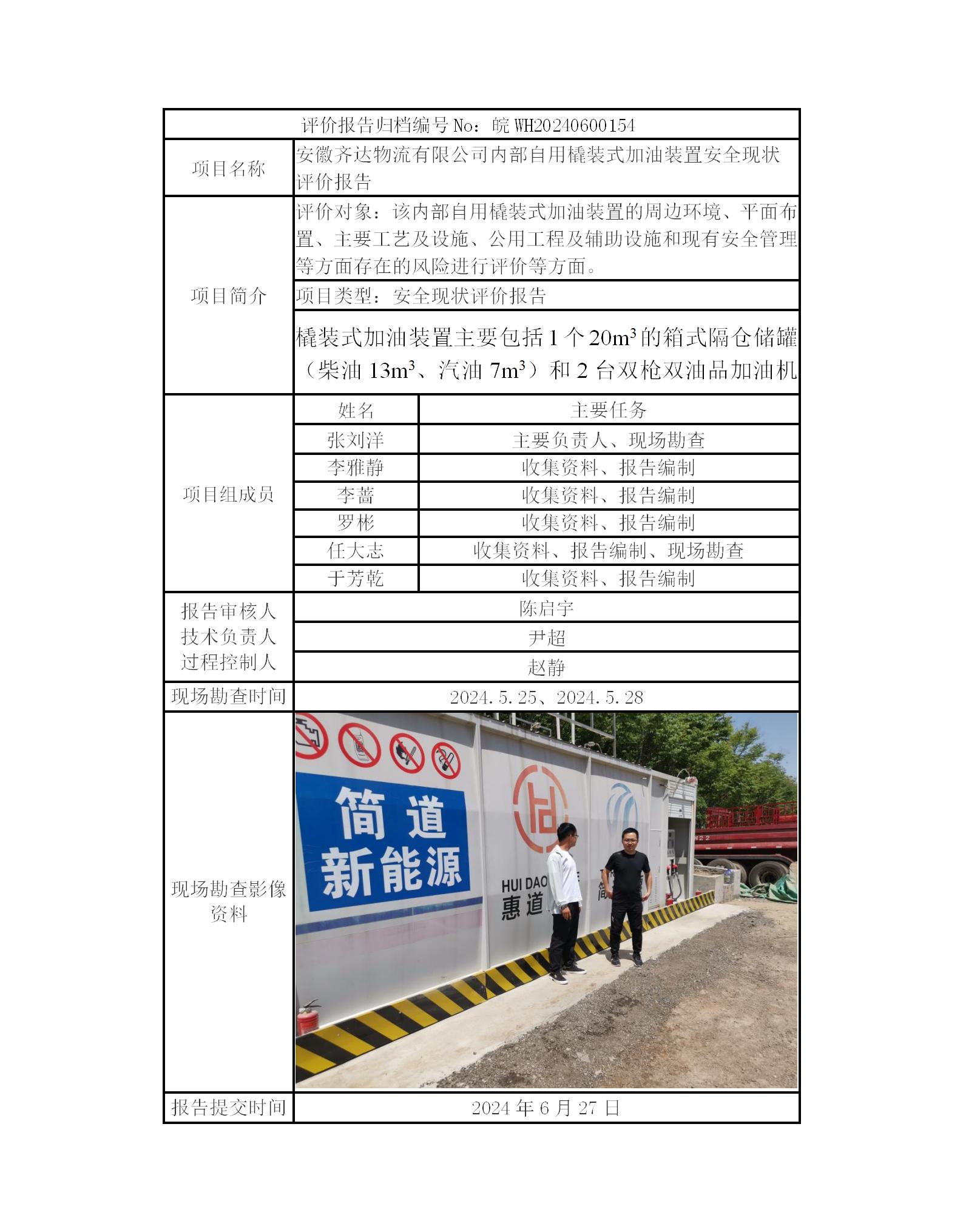 安徽齊達(dá)物流有限公司內(nèi)部自用橇裝式加油裝置安全現(xiàn)狀評(píng)價(jià)報(bào)告