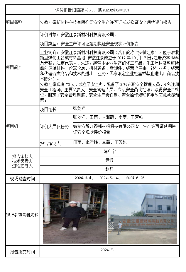 安徽江泰新材料科技有限公司安全生產許可證延期換證安全現狀評價報告