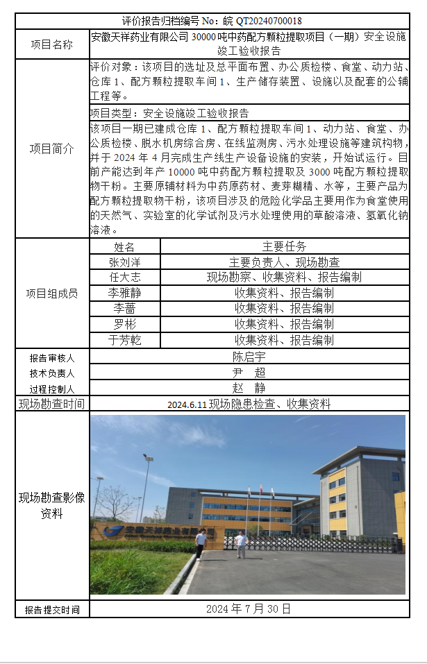 安徽天祥藥業有限公司30000噸中藥配方顆粒提取項目(一期)安全設施竣工驗收報告
