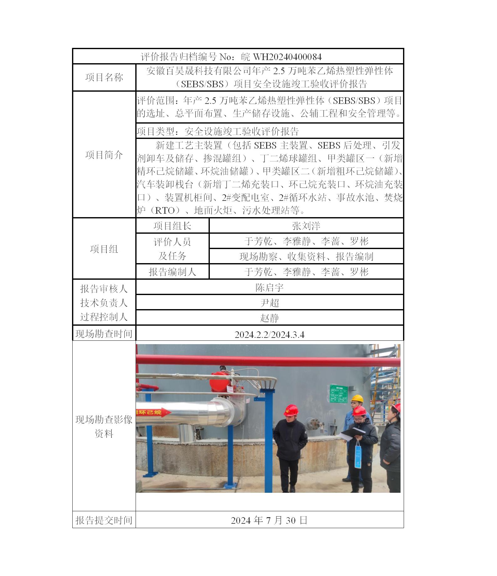 安徽百昊晟科技有限公司年產2.5萬噸苯乙烯熱塑性彈性體(SEBS/SBS)項目安全設施竣工驗收評價報告