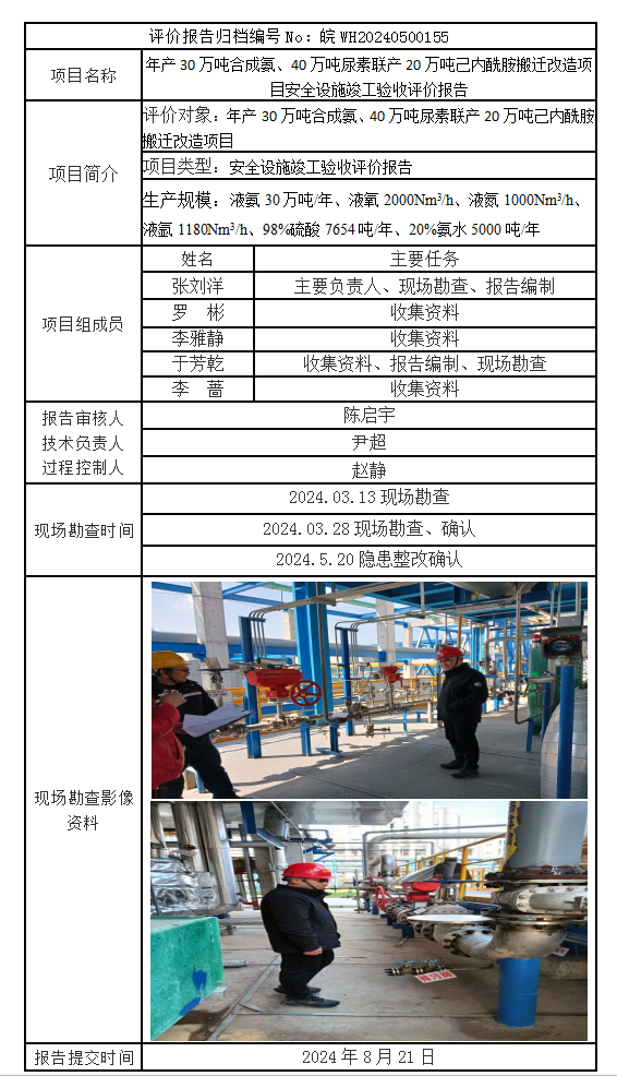 年產30萬噸合成氨、40萬噸尿素聯產20萬噸己內酰胺搬遷改造項目安全設施竣工驗收評價報告