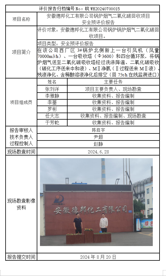 安徽德邦化工有限公司鍋爐煙氣二氧化碳回收項目 安全預評價報告