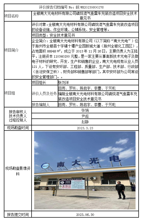 全椒南大光電材料有限公司磷烷混氣魚雷車充裝改造項目安全技術(shù)意見書