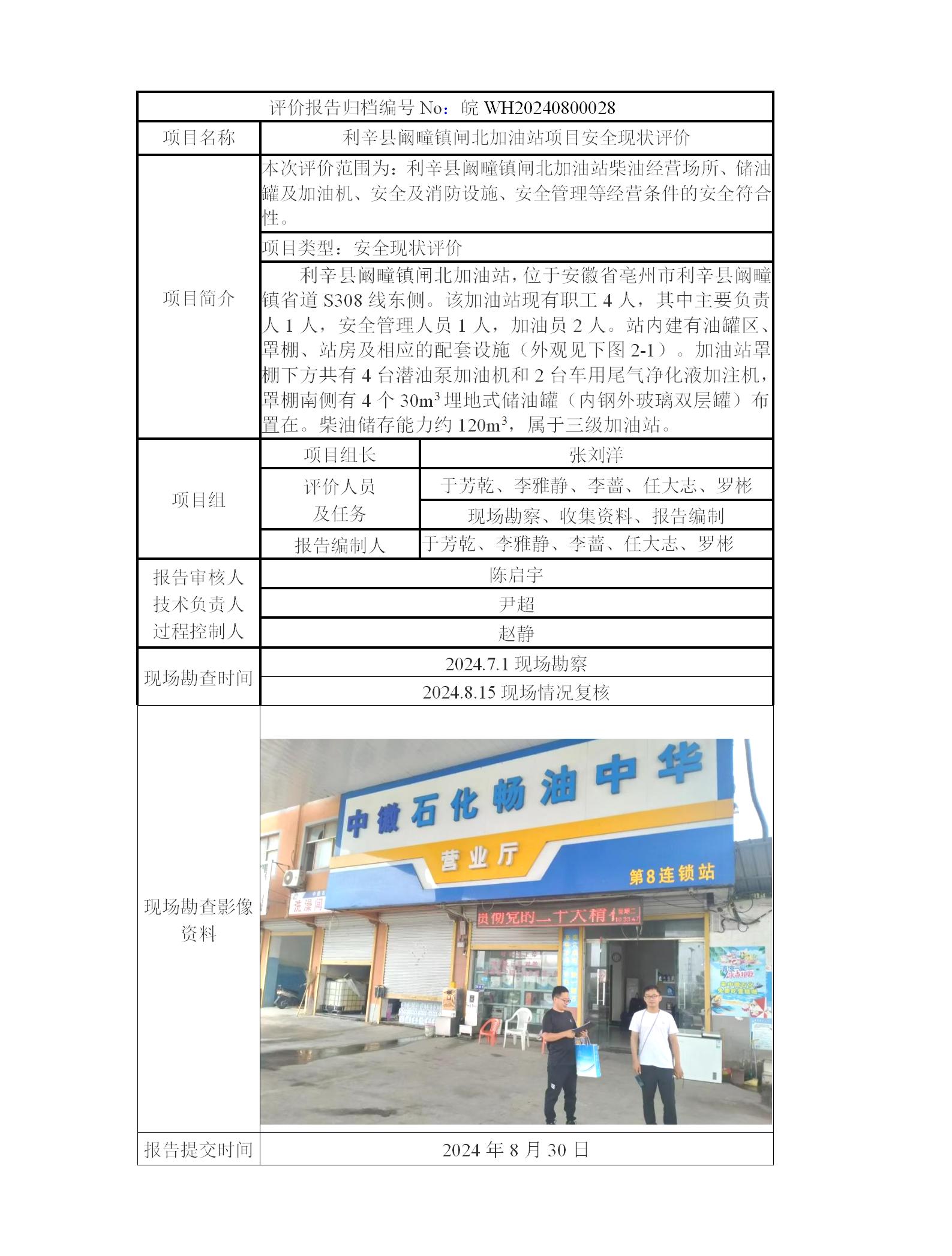 利辛縣闞疃鎮(zhèn)閘北加油站項目安全現(xiàn)狀評價