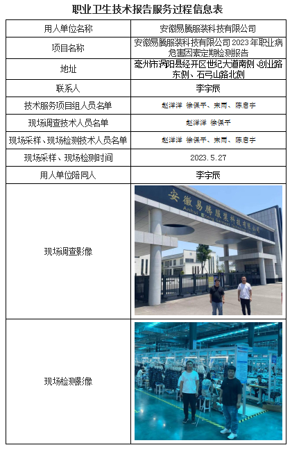 安徽易騰服裝科技有限公司2023年職業病危害因素定期檢測報告