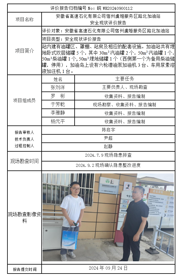 安徽省高速石化有限公司宿州虞姬服務區路北加油站 安全現狀評價報告
