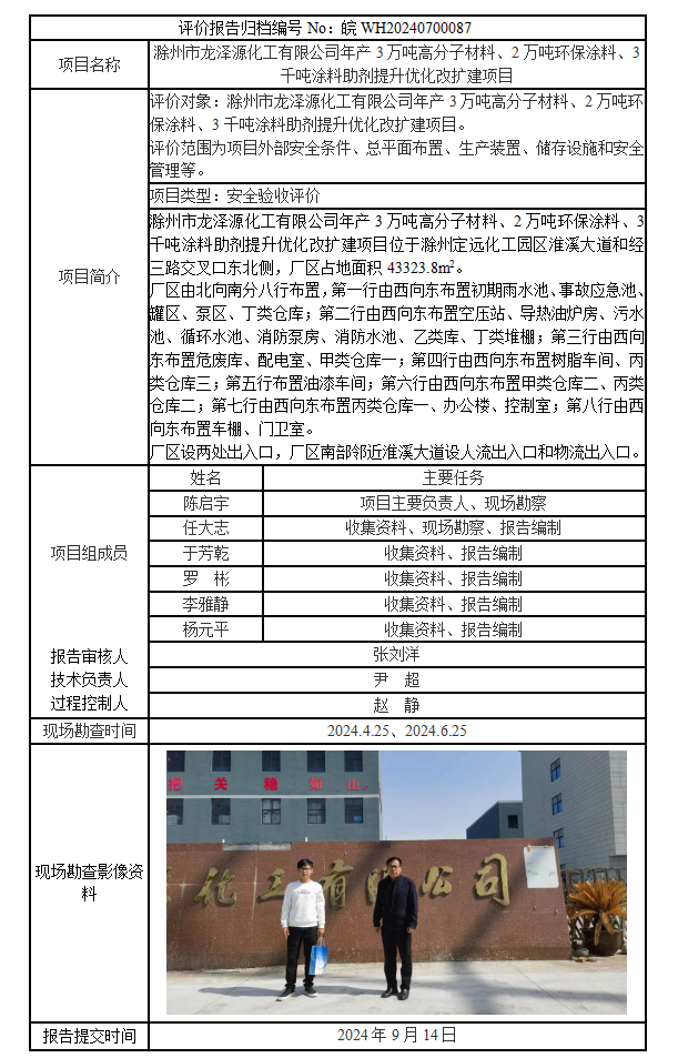 滁州市龍澤源化工有限公司年產3萬噸高分子材料、2萬噸環保涂料、3千噸涂料助劑提升優化改擴建項目