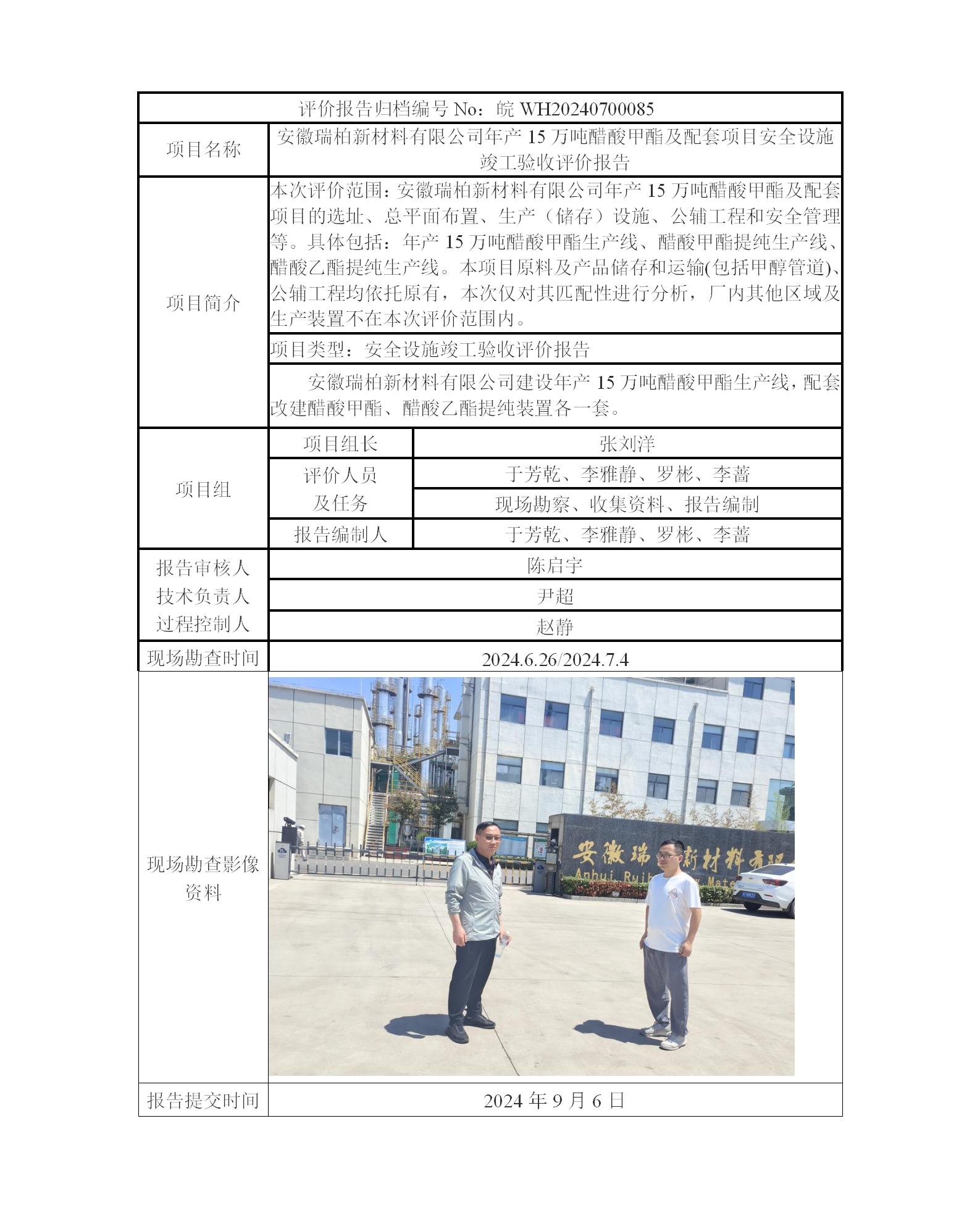 安徽瑞柏新材料有限公司年產15萬噸醋酸甲酯及配套項目安全設施竣工驗收評價報告