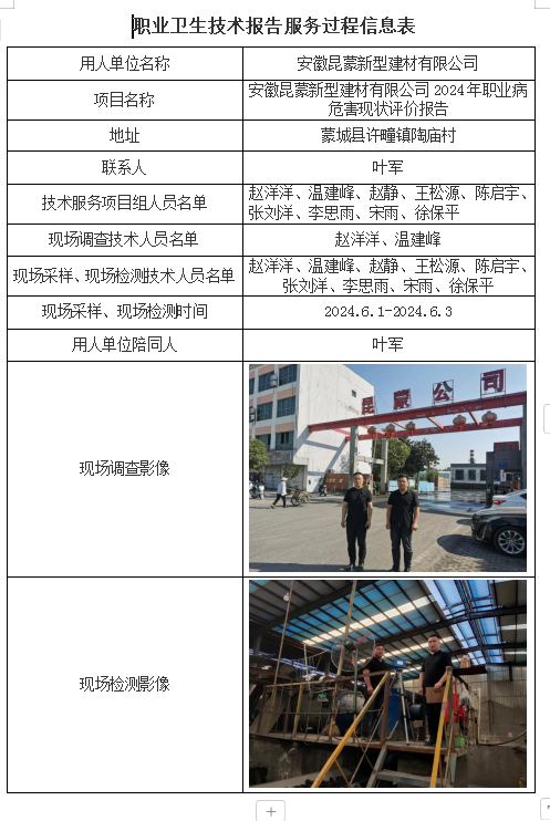 安徽昆蒙新型建材有限公司2024年職業病危害現狀評價報告