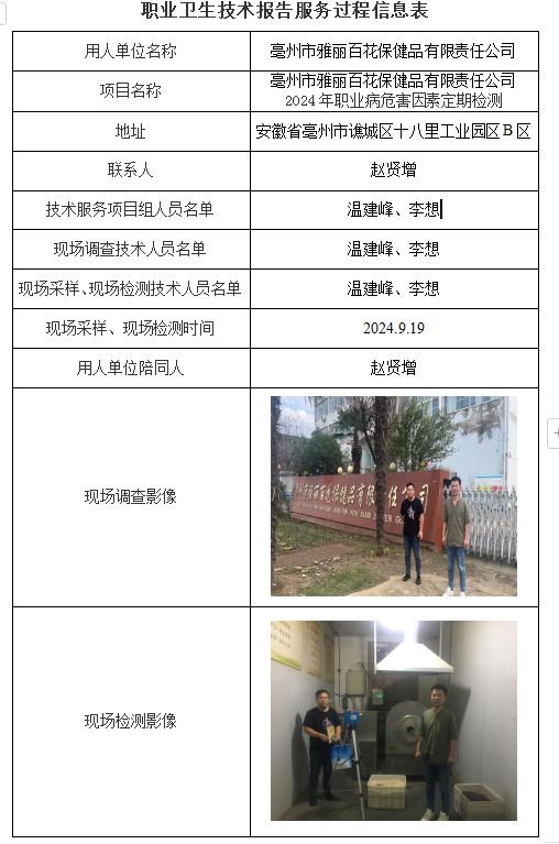 亳州市雅麗百花保健品有限責任公司2024年職業病危害因素定期檢測