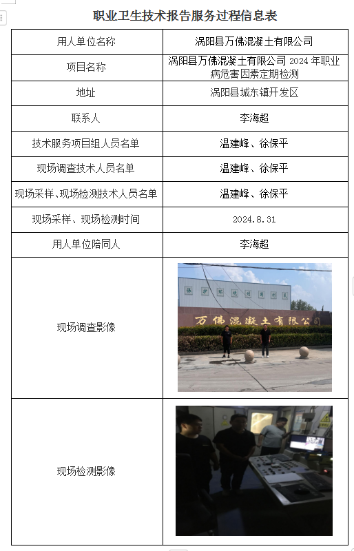 渦陽縣萬佛混凝土有限公司2024年職業病危害因素定期檢測