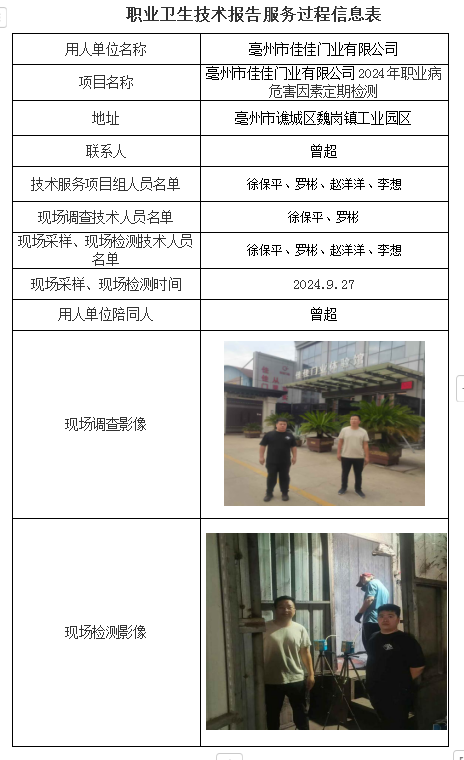 亳州市佳佳門業有限公司2024年職業病危害因素定期檢測