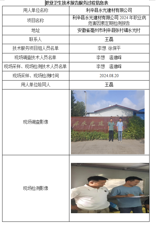 利辛縣永光建材有限公司2024年職業病危害因素定期檢測報告