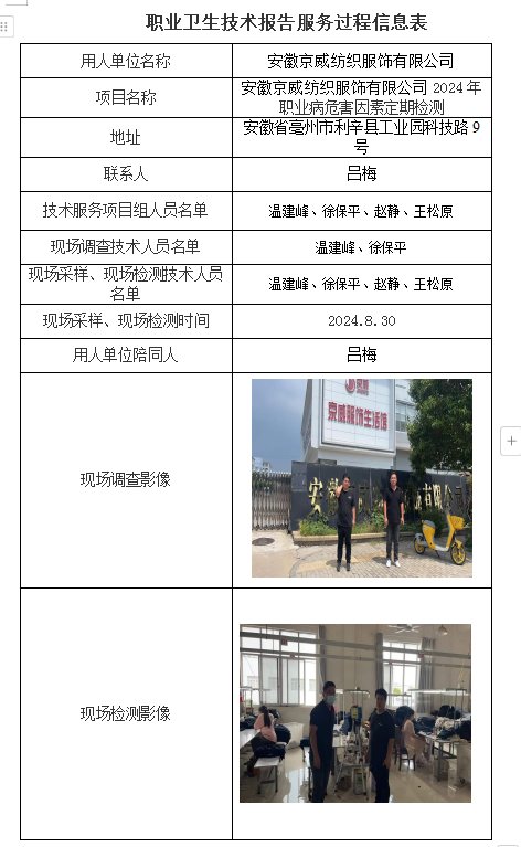 安徽京威紡織服飾有限公司2024年職業病危害因素定期檢