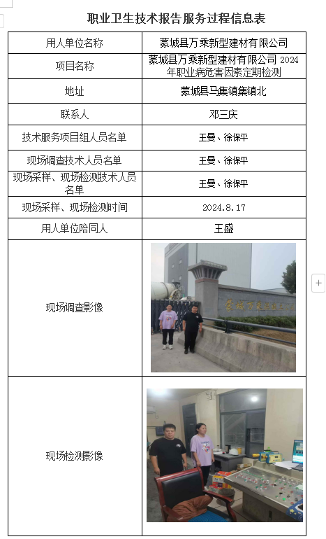 蒙城縣萬乘新型建材有限公司2024年職業病危害因素定期檢測