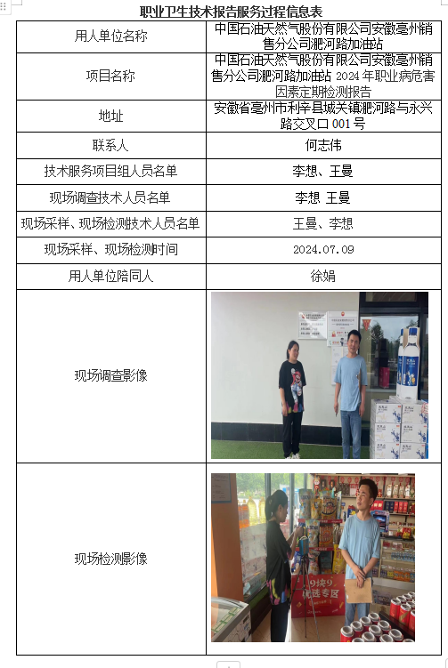 中國石油天然氣股份有限公司安徽亳州銷售分公司淝河路加油站2024年職業病危害因素定期檢測報告