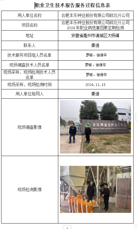 合肥豐樂種業股份有限公司皖北分公司2024年職業病危害因素定期檢測