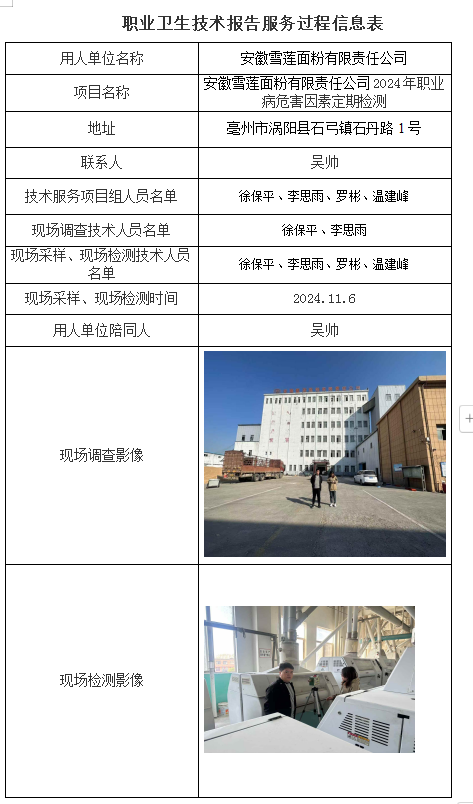安徽雪蓮面粉有限責任公司2024年職業病危害因素定期檢測