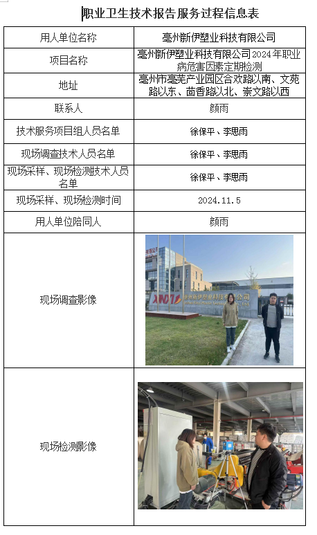 亳州新伊塑業科技有限公司2024年職業病危害因素定期檢測