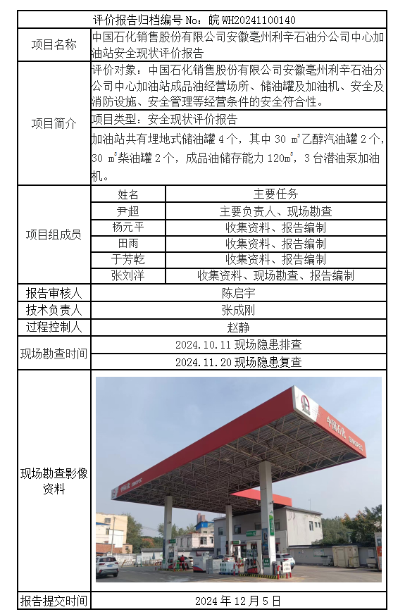 中國石化銷售股份有限公司安徽亳州利辛石油分公司中心加油站安全現狀評價報告