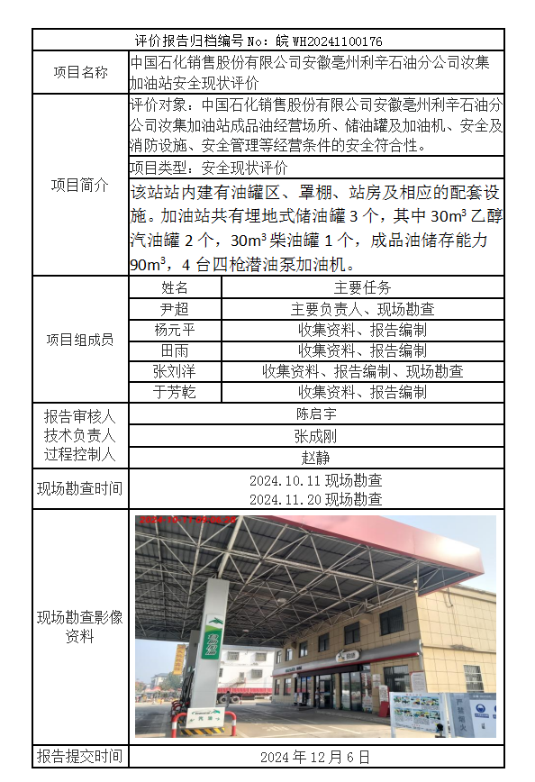 中國(guó)石化銷售股份有限公司安徽亳州利辛石油分公司汝集加油站安全現(xiàn)狀評(píng)價(jià)