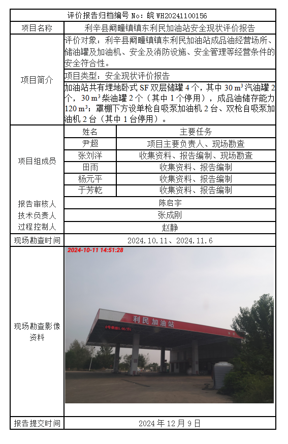 利辛縣闞疃鎮(zhèn)鎮(zhèn)東利民加油站安全現(xiàn)狀評(píng)價(jià)報(bào)告