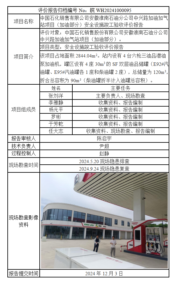 中國石化銷售有限公司安徽淮南石油分公司中興路加油加氣站項目(加油部分)安全設施竣工驗收評價報告