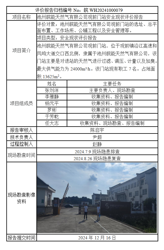 池州皖能天然氣有限公司觀前門站安全現(xiàn)狀評價報告