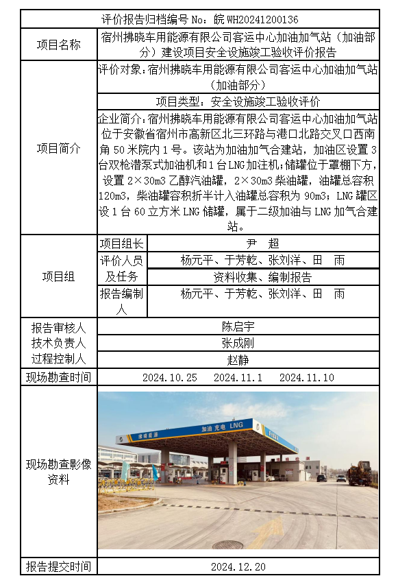 宿州拂曉車用能源有限公司客運中心加油加氣站(加油部分)建設項目安全設施竣工驗收評價報告