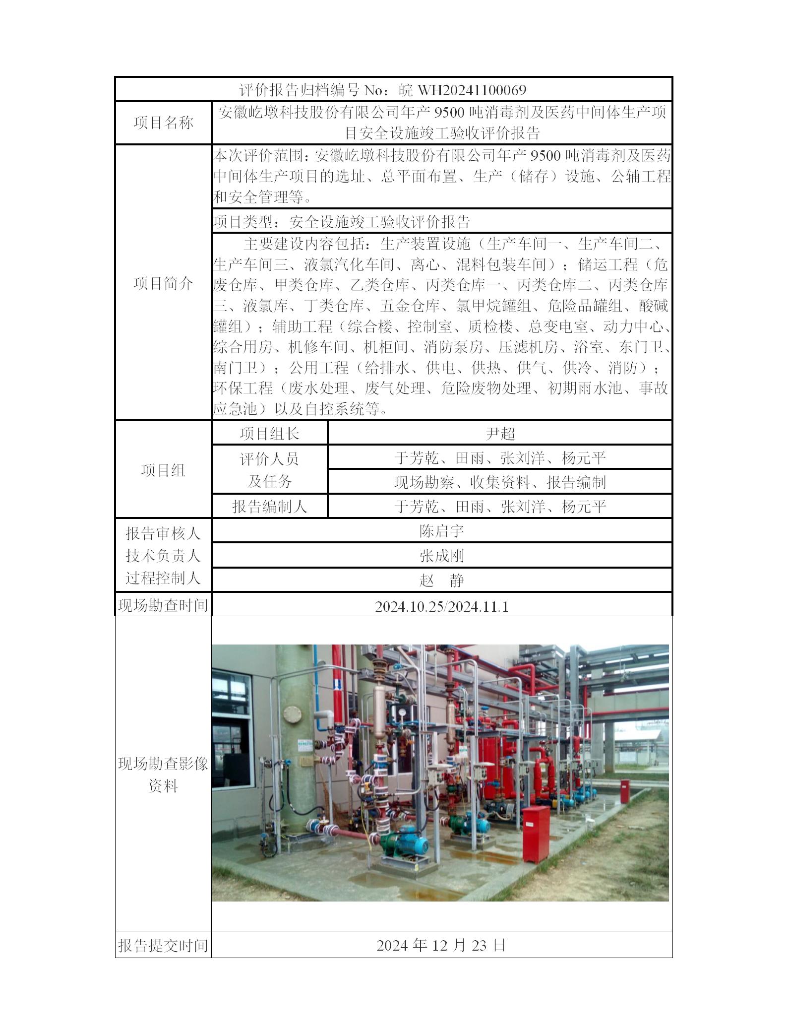 安徽屹墩科技股份有限公司年產(chǎn)9500噸消毒劑及醫(yī)藥中間體生產(chǎn)項(xiàng)目安全設(shè)施竣工驗(yàn)收評(píng)價(jià)報(bào)告