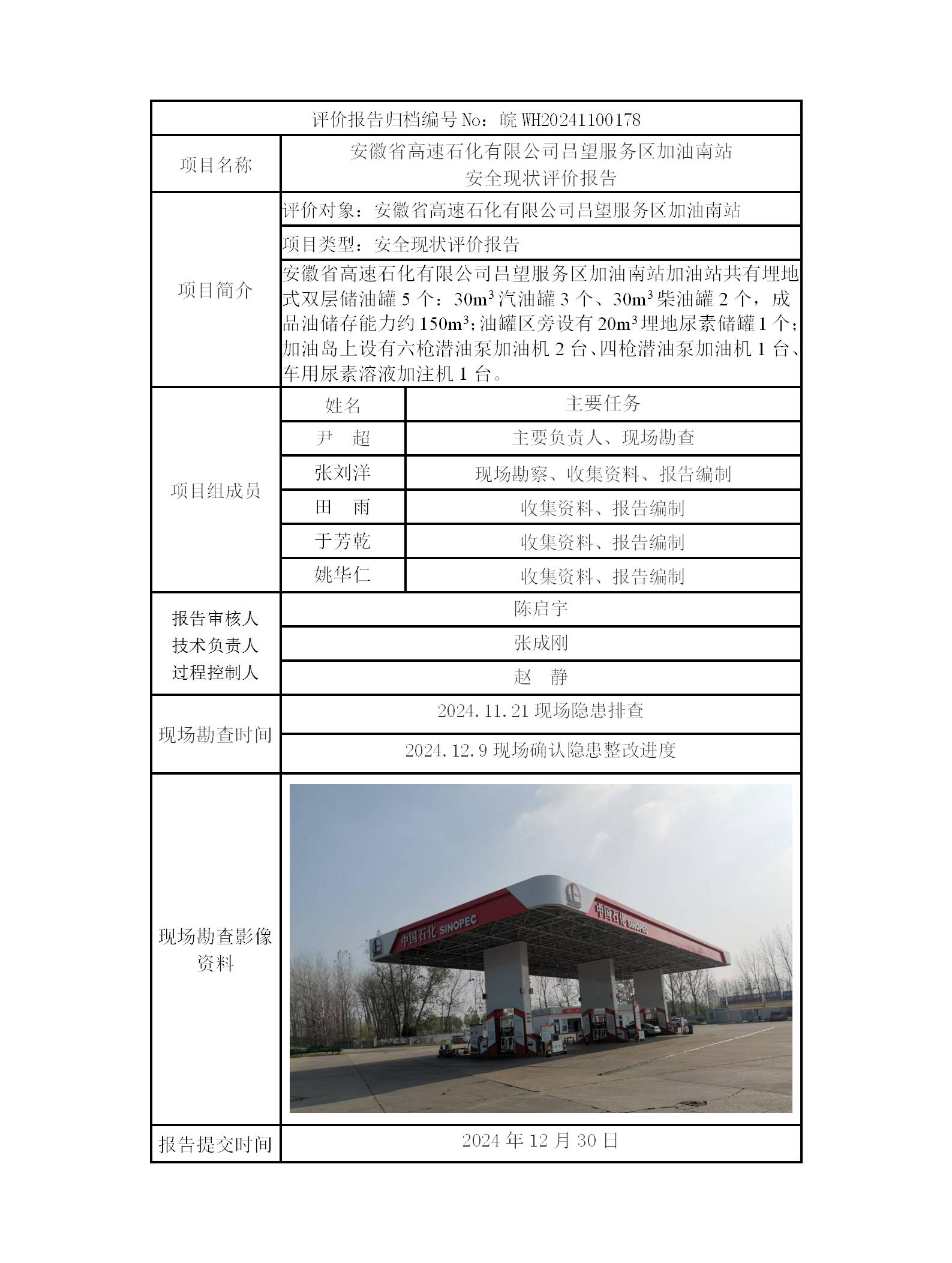安徽省高速石化有限公司呂望服務區加油南站 安全現狀評價報告